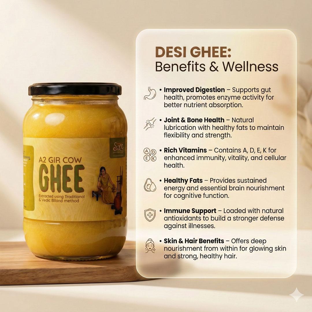 Premium A2 Gir Cow Ghee made from the milk of grass-fed desi Gir cows. Slow-churned using the traditional bilona method for maximum nutrition, aroma, and purity. Chemical-free, preservative-free, and crafted in small batches. Secure packaging available for nationwide delivery across India.