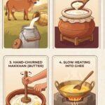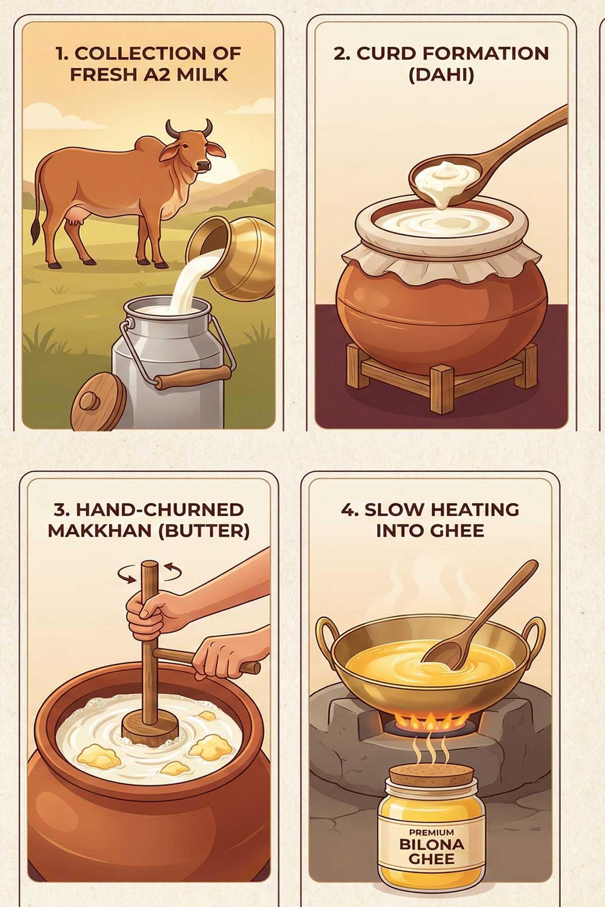 Fresh A2 Milk from Gir Cows is cultured into curd, hand-churned into White Butter, and slow-heated on a low flame. This traditional Bilona process produces naturally clarified Golden Ghee with superior aroma, nutrition, and digestibility.