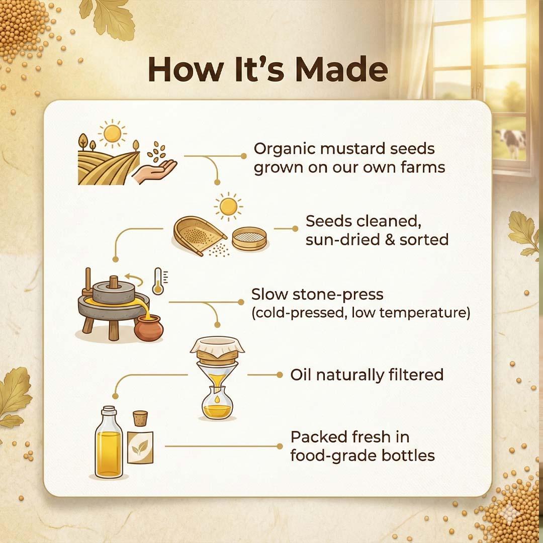 Cold pressed organic mustard oil is extracted from organically grown mustard seeds using a slow, low-temperature pressing method. This preserves the oil’s natural aroma, antioxidants, vitamins, and healthy fats. Because no heat, chemicals, or solvents are used, the oil stays pure, strong in flavour, and nutritionally rich — ideal for Indian cooking, pickles, and wellness routines.